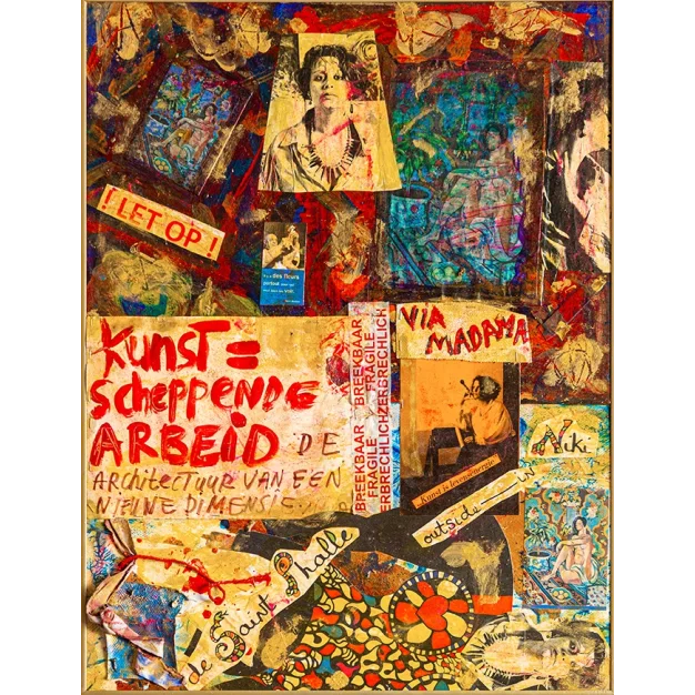 Collection Tradition d' Ateliers Kunst =Scheppende Arbeid, mixed media, 85 x 65 cm, 1998- 2021 nr 7 1275 euro I have made collages all my life, this is a special series Collection Tradition d'Ateliers in which I used many objects that I have collected in my studio over the years till they fit seamlessly in these collages. More info about Madama's work Click HERE