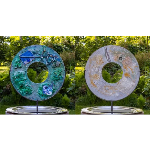 Tableau Vivante- Firenze, mixed media on wood, 35 cm, 2019 The wooden circle is adorned by many meaningful objects. You see verso and recto of this artwork. More info on Madama Click HERE