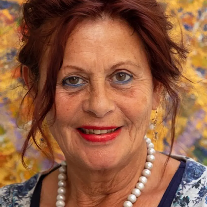 Madama has had several galleries in Amsterdam and later in Amersfoort. She has exhibited at the Stedelijk Museum Amsterdam in two group exhibitions in 1978 and 1979 and a performance. In 1986, she founded Villa Baranka (1986-1988). Villa Baranka was a crossover of different disciplines; namely painting/theater/music and dinners that thematically connected to the theme of the exhibition. In November 2018, the archive of Villa Baranka was transferred to ATRIA, the knowledge institute for emancipation and women's history. In 1996, she founded Capella Almadama in Amersfoort, an Art & Education center (1996-2002). Here, new exhibitions of her work with poems and a concert where the audience determined the paintings to be played were arranged every 6 weeks. She developed workshops, among others for De Baak and Nyenrode Business University on dynamic leadership. These Artventures (a combination of Art and adventure) were tailored to purpose, target audience, and the results to be achieved. In 2002, she moved to Maria Hoop. Here she has a gallery, studio, and coaching practice. Under the title 'Madama Modern Sacred Art from the Heart', she had a large retrospective exhibition in 2016 at the ECI Cultural Factory Roermond. The most recent project is the Color Temple, consisting of 12 canvases of 220 x 150 cm, one side a monochrome often with a structure, the other side an 'emblem' on a white background. (2017-2019) Madama lives and works in Maria Hoop (L) and exhibits both nationally and internationally.