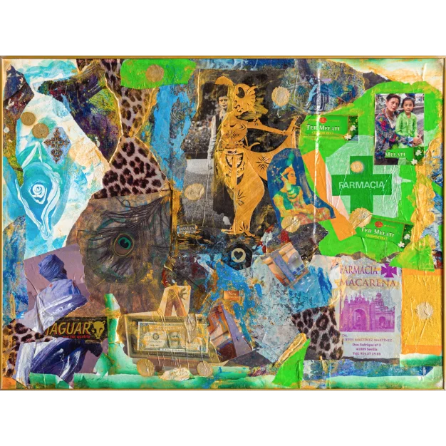 Melati, mixed media, 71 x 94 cm, 2021 nr 2 I have made collages for decades, various images and objects are incorporated into a story. These are images that I have hung or stored in my studios for years until they fit seamlessly into a whole. I have made collages all my life, this is a special series Collection Tradition d'Ateliers in whichI l used many objects that I have collected in my studio over the years till they fit seamlessly in these collages. More info about Madama's work Click HERE