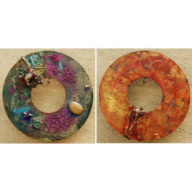 Esperanza Geneeskundige Vrouw-Wijsheid 2 zijden geschilderde houten cirkel met verschillende objecten. De houten cirkel is versierd met veel betekenisvolle objecten. Je ziet de voor- en achterkant van dit kunstwerk. Meer info over Madama Klik HIER